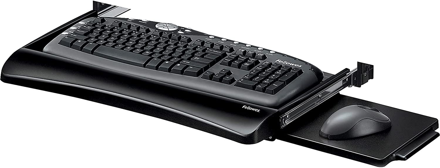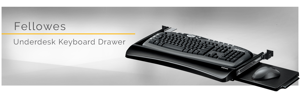 Fellowes Office Suites Underdesk Keyboard Drawer moves keyboard and mouse off the desktop to save workspace. Features 3 height adjustments to suit preferred work position. Mouse tray mounts to right or left side of keyboard tray or stows underneath when not in use. Attractive new look and color blends with any office décor. Sturdy, impact-resistant tray fits standard keyboards. 23 ½” wide space required for installation